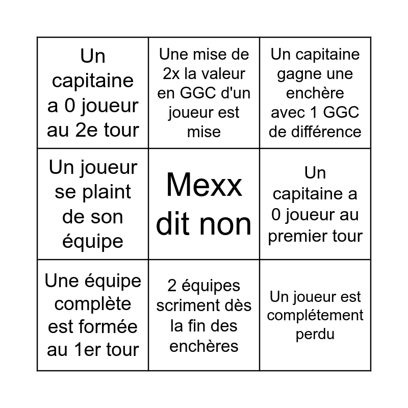 This bingo card has a free space and 8 words: Un capitaine a 0 joueur au premier tour, Un capitaine gagne une enchère avec 1 GGC de différence, Une mise de 2x la valeur en GGC d'un joueur est mise, Une équipe complète est formée au 1er tour, Un capitaine a 0 joueur au 2e tour, Un joueur est complétement perdu, Un joueur se plaint de son équipe and 2 équipes scriment dès la fin des enchères.