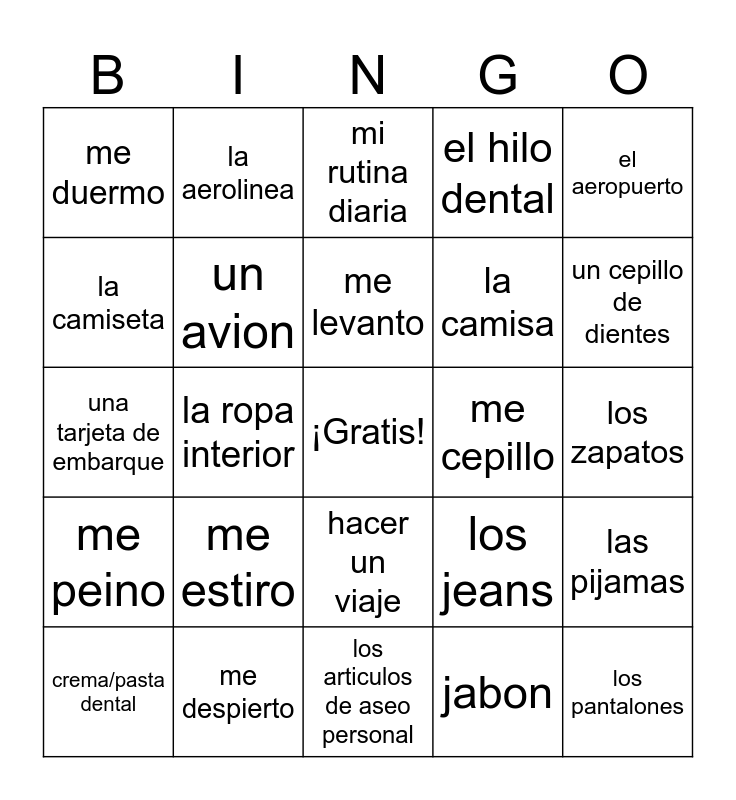 This bingo card has a free space and 34 words: champu, jabon, hacer la maleta, el rollo de papel higienico, me peino, un avion, el aeropuerto, crema/pasta dental, la aerolinea, un sueter, me levanto, mi rutina diaria, me lavo, el vestido, me cepillo, un cepillo de dientes, me despierto, una tarjeta de embarque, me estiro, los jeans, hacer un viaje, la ropa, me duermo, los zapatos, los articulos de aseo personal, los pantalones, el hilo dental, la crema corporal, la camisa, la camiseta, la falda, la ropa interior, las pijamas and una sudadera.