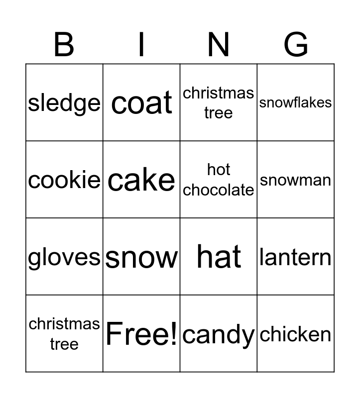 This bingo card has 16 words: Free!, lantern, christmas tree, sledge, gloves, coat, hat, candy, cookie, cake, christmas tree, snowflakes, snow, snowman, hot chocolate and chicken.