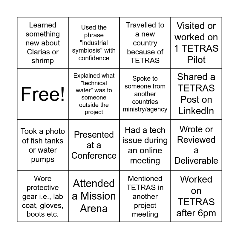 This bingo card has 16 words: Attended a Mission Arena, Wrote or Reviewed a Deliverable, Travelled to a new country because of TETRAS, Learned something new about Clarias or shrimp, Took a photo of fish tanks or water pumps, Used the phrase "industrial symbiosis" with confidence, Had a tech issue during an online meeting, Mentioned TETRAS in another project meeting, Free!, Explained what "technical water" was to someone outside the project, Wore protective gear i.e., lab coat, gloves, boots etc., Visited or worked on 1 TETRAS Pilot, Presented at a Conference, Shared a TETRAS Post on LinkedIn, Spoke to someone from another countries ministry/agency and Worked on TETRAS after 6pm.