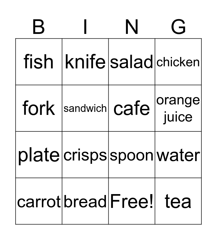 This bingo card has 17 words: Free!, carrot, salad, fish, crisps, chicken, water, cafe, orange juice, sandwich, bread, spoon, fork, knife, plate, chocolate and tea.