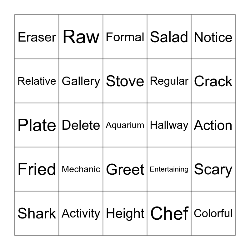 This bingo card has 30 words: Activity, Cough, Delete, Emergency, Eraser, Formal, Gallery, Greet, Hallway, Height, Action, Aquarium, Chef, Colorful, Crack, Drama, Entertaining, Fried, Mechanic, Notice, Plate, Poster, Raw, Regular, Relative, Salad, Scary, Shark, Stove and Uniform.