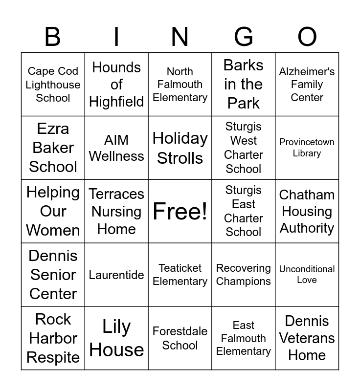 This bingo card has a free space and 29 words: Rock Harbor Respite, Mullen Hall Elementary, Terraces Nursing Home, Hyannis Veterans Home, Cape Cod Lighthouse School, North Falmouth Elementary, AIM Wellness, Laurentide, Sturgis East Charter School, Lily House, Chatham Housing Authority, Dennis Veterans Home, Forestdale School, East Falmouth Elementary, Provincetown Library, Eastham Library, Teaticket Elementary, Dennis Senior Center, Alzheimer's Family Center, Helping Our Women, Recovering Champions, Dennis Memorial Library, Sturgis West Charter School, Ezra Baker School, Barks in the Park, Hounds of Highfield, Unconditional Love, Holiday Strolls and Cape Cod Dog Fest.