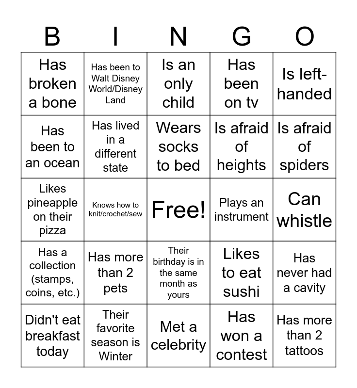 This bingo card has a free space and 24 words: Has more than 2 pets, Their favorite season is Winter, Wears socks to bed, Didn't eat breakfast today, Is left-handed, Has broken a bone, Has been to an ocean, Has been to Walt Disney World/Disney Land, Plays an instrument, Their birthday is in the same month as yours, Is afraid of heights, Likes pineapple on their pizza, Likes to eat sushi, Has never had a cavity, Has lived in a different state, Has won a contest, Can whistle, Is an only child, Is afraid of spiders, Knows how to knit/crochet/sew, Has more than 2 tattoos, Has a collection (stamps, coins, etc.), Has been on tv and Met a celebrity.
