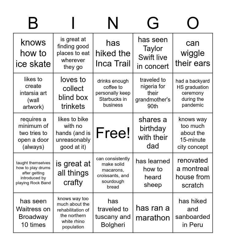 This bingo card has a free space and 82 words: eye has been featured on the SalesForce Tower in SF, is a former 110m Hurdler, has hiked the Inca Trail, has walked the Camino de Santiago, is a vinyl record collector, creates art content creation and shares to social media, has a goal to see all 30 baseball stadiums, has hiked the The Wave in Arizona, traveled to 10+ countries while studying abroad, last names translates to blackberry house in Dutch, enjoys beading, embroidery, and reading, favorite filmmaker is Krzysztof Kieslowski, loves to collect blind box trinkets, shares a birthday with their dad, likes to rock climb, knows how to ice skate, has seen Waitress on Broadway 10 times, likes to create intarsia art (wall artwork), has read (or is currently reading) Crime and Punishment, is on the Bridges and Civil Structures team, has lived in 5 different countries on 3 continents, traveled to nigeria for their grandmother's 90th, has hiked and sanboarded in Peru, can wiggle their ears, likes to bike with no hands (and is unreasonably good at it), can belly dance like Shakira, has traveled to Honduras, makes really good food, can spin a plate, can name every US president in order, is great at all things crafty, is from the Bogota office, requires a minimum of two tries to open a door (always), is good at escape rooms, is a certified bilingual interpreter, has traveled to tuscany and Bolgheri, favorite class in college was social psychology, has completed one fo the most difficult hiking trails in Quebec, had a backyard HS graduation ceremony during the pandemic, participated in the NY office move grafiti, plant parade, and tye-dye festivities, has sewen their own work top, has seen Taylor Swift live in concert, favorite class in college was Hydraulics (had an awesome professor), graduated high school in a car (Covid drive-through ceremony), is great at making friends in every country they travel to, is great at finding good places to eat wherever they go, knows way too much about Board games and Roller Coasters, drinks enough coffee to personally keep Starbucks in business, likes to dance with strangers they meet in other countries, would be famous for winning at world series of poker, knows way too much about music production, knows way too much about the 15-minute city concept, knows way too much about the rehabilitation of the northern white rhino population, is known for always having so much good luck, is orignally from California, likes to try to learn new musical instruments and not succeed, loves to drink cranberry juice, is an Atletico Bucaramanga fan, has really poor sense of direction, has learned how to heard sheep, has learned how to train birds, owns (and has tamed) two parakeets, taught themselves how to play drums after getting introduced by playing Rock Band, is a CF Montreal fan, taught themself how to detail a car, can make various battery types from scratch, taught themselves how to juggle (through YouTube tutorials), has hiked a 14er, plays Gaelic Football, is originally from India, attened University of Toronto for University/College, made it through university/college without pulling an all-nighter, can consistently make solid macarons, croissants, and sourdough bread, has ran a marathon, has had to count cars for a transportation project, was a rangemaster for their schools archery club, has turtored elementary students for their visual arts class, placed 2nd in the Architectural Technology and Design Skills Ontario Competition (2025), hiked 150km through the spanish countryside of Camino de Santiago, started a small photography business, renovated a montreal house from scratch and bench pressed 315lbs (~140 kg).