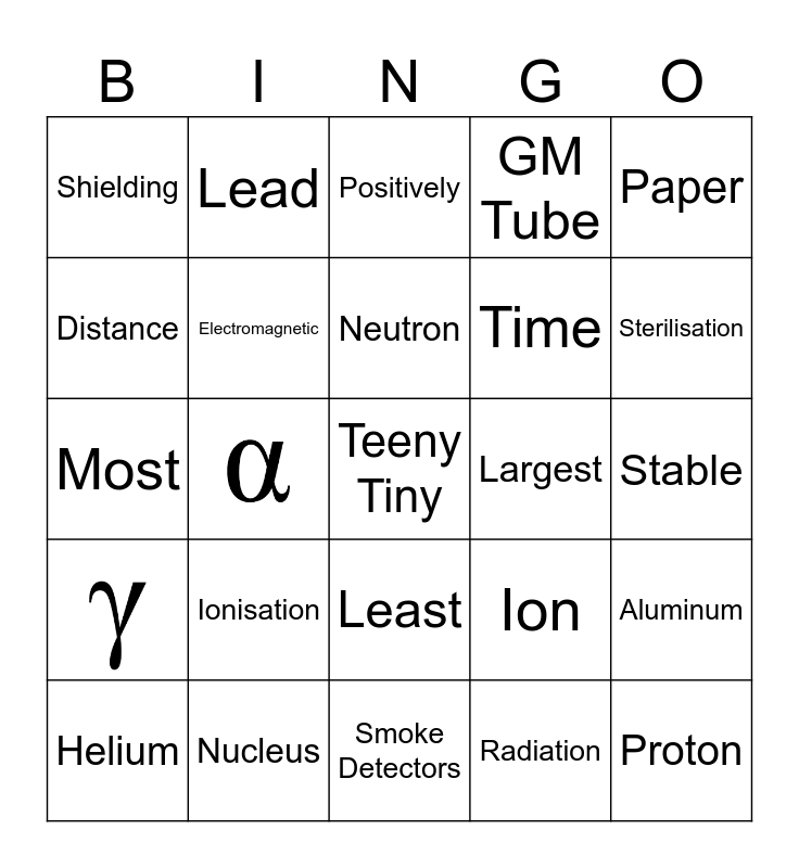 This bingo card has 3 images and 29 words: Radiation, Radioactive, Electromagnetic, Paper, Aluminum, Lead, Proton, Neutron, Positively, Negatively, Neutrally/not, Largest, Electron, Helium, Most, Least, Ionisation, Ion, Isotope, Stable, Nucleus, Teeny Tiny, GM Tube, Time, Distance, Shielding, Smoke Detectors, Medical Tracers and Sterilisation.