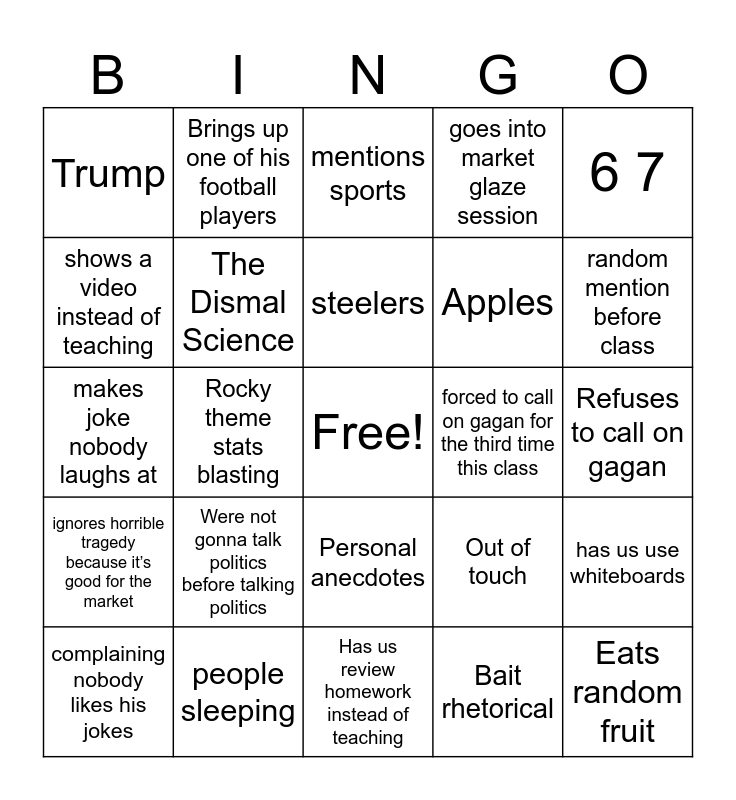 This bingo card has a free space and 27 words: Out of touch, Politics, Apples, Has us review homework instead of teaching, shows a video instead of teaching, mentions sports, Brings up one of his football players, ignores horrible tragedy because it’s good for the market, forced to call on gagan for the third time this class, has us use whiteboards, makes joke nobody laughs at, goes into market glaze session, complaining nobody likes his jokes, people sleeping, random mention before class, we will not talk about politics before politics, The Dismal Science, steelers, Were not gonna talk politics before talking politics, Trump, Refuses to call on gagan, Bait rhetorical, Rocky theme stats blasting, Eats random fruit, Personal anecdotes, 6 7 and Complains about us not responding.