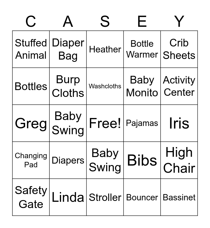 This bingo card has a free space and 48 words: Onesies, Bassinet, Car Seat, Stroller, Diapers, Wipes, Diaper Bag, Breast Pump, Bottles, Pacifiers, Burp Cloths, Bottle Warmer, High Chair, Bibs, Baby Food Maker, Baby Towels, Washcloths, Pajamas, Blanket, Crib Sheets, Baby Swing, Bouncer, Stuffed Animal, Baby Monito, Books, Activity Center, Safety Gate, Thermometer, Baby Swing, Changing Pad, Patricia, Casey, Dorinda, Diane, Linda, Audra, Sophia, Iris, Nikki, Breanna, Sylvia, Dylan, Heather, Blythe, Greg, Sarah, Emma and Hannah.