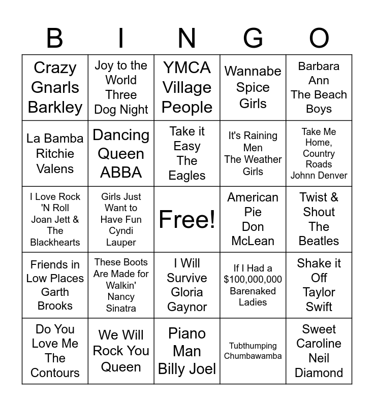 This bingo card has a free space and 35 words: Respect Aretha Franklin, Shout The Isley Brothers, Come on Eileen Dexys Midnight Runners, Dancing Queen ABBA, I Will Survive Gloria Gaynor, Wannabe Spice Girls, La Bamba Ritchie Valens, Don't Stop Believin' Journey, Take it Easy The Eagles, Baby Got Back Sir Mix-A-Lot, I Love Rock 'N Roll Joan Jett & The Blackhearts, Barbara Ann The Beach Boys, Bad, Bad Leroy Brown Jim Croce, Lola The Kinks, Crazy Gnarls Barkley, American Pie Don McLean, Tubthumping Chumbawamba, Girls Just Want to Have Fun Cyndi Lauper, Friends in Low Places Garth Brooks, Sweet Caroline Neil Diamond, If I Had a $100,000,000 Barenaked Ladies, Do You Love Me The Contours, Shake it Off Taylor Swift, We Will Rock You Queen, YMCA Village People, Take Me Home, Country Roads Johnn Denver, Free Bird Lynyrd Skynyrd, Summer Nights John Travolta & Olivia Newton John, It's Raining Men The Weather Girls, Twist & Shout The Beatles, Mr. Brightside The Killers, Piano Man Billy Joel, These Boots Are Made for Walkin' Nancy Sinatra, Joy to the World Three Dog Night and Margaritaville Jimmy Buffett.