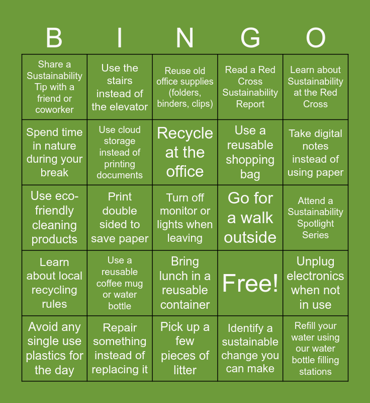 This bingo card has 25 words: Use a reusable coffee mug or water bottle, Pick up a few pieces of litter, Recycle at the office, Avoid any single use plastics for the day, Learn about Sustainability at the Red Cross, Share a Sustainability Tip with a friend or coworker, Spend time in nature during your break, Use the stairs instead of the elevator, Go for a walk outside, Bring lunch in a reusable container, Use a reusable shopping bag, Use eco-friendly cleaning products, Free!, Unplug electronics when not in use, Use cloud storage instead of printing documents, Refill your water using our water bottle filling stations, Attend a Sustainability Spotlight Series, Reuse old office supplies (folders, binders, clips), Take digital notes instead of using paper, Print double sided to save paper, Turn off monitor or lights when leaving, Repair something instead of replacing it, Learn about local recycling rules, Read a Red Cross Sustainability Report and Identify a sustainable change you can make.