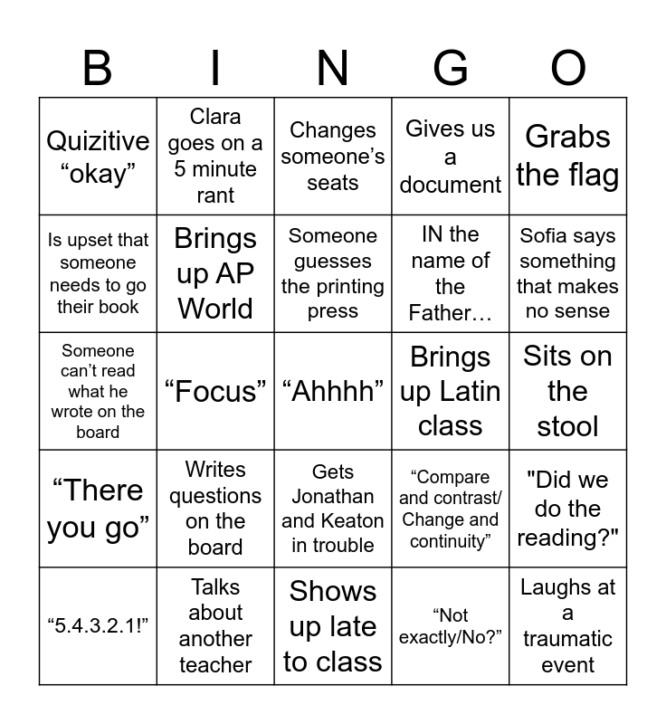 This bingo card has 29 words: “5.4.3.2.1!”, Speaks in another language/ accent, “Focus”, Laughs at a traumatic event, Quizitive “okay”, Changes someone’s seats, Brings up AP World, Writes questions on the board, Brings up Latin class, Talks about another teacher, Sits on the stool, “Ahhhh”, Shows up late to class, “Not exactly/No?”, Sofia says something that makes no sense, Valeria eats her snacks, Gets Jonathan and Keaton in trouble, “There you go”, Grabs the flag, Someone can’t read what he wrote on the board, “Compare and contrast/ Change and continuity”, Clocks someone’s tea, IN the name of the Father…, Is upset that someone needs to go their book, Gives us a document, Clara goes on a 5 minute rant, "Did we do the reading?", Someone guesses the printing press and Valeria and Elena get in trouble.