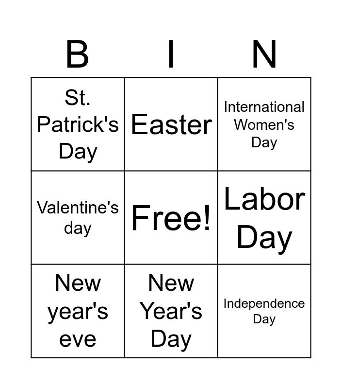 This bingo card has a free space and 14 words: Christmas, Mother's day, New year's eve, Easter, Valentine's day, Independence Day, Halloween, Teacher's day, New Year's Day, St. Patrick's Day, Thanksgiving, Labor Day, International Women's Day and April Fool's Day.