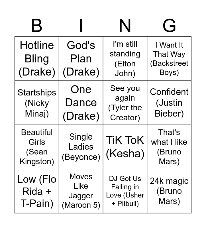 This bingo card has 32 words: California Girls (Katy Perry), Pokerface (Lady Gaga), That's what I like (Bruno Mars), What Makes You Beautiful (One Direction), 24k magic (Bruno Mars), See you again (Tyler the Creator), Startships (Nicky Minaj), Crazy In Love (Beyonce + Jay-Z), God's Plan (Drake), Baby (Justin Bieber), Confident (Justin Bieber), I'm still standing (Elton John), Starman (David Bowie), Location (Playboy Carti), Moves Like Jagger (Maroon 5), Made you look (Meghan Trainor), Hips Don't lie (Shakira), TiK ToK (Kesha), Shut Up and Dance (Walk the Moon, Party in the U.S.A. (Miley Cirus), Closer (Chainsmokers + Halsey), Die Young (Kesha), DJ Got Us Falling in Love (Usher + Pitbull), Firework (Katy Perry), Low (Flo Rida + T-Pain), I Want It That Way (Backstreet Boys), Beautiful Girls (Sean Kingston), One Dance (Drake), Hotline Bling (Drake), Roxanne (Arizona Zervas), Stereo Love (Edward Maya) and Single Ladies (Beyonce).