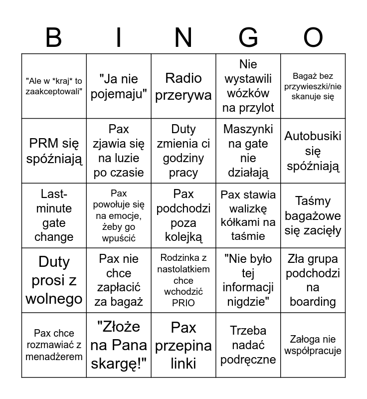 This bingo card has a free space and 24 words: Pax nie chce zapłacić za bagaż, "Złoże na Pana skargę!", Duty zmienia ci godziny pracy, Pax chce rozmawiać z menadżerem, Bagaż bez przywieszki/nie skanuje się, "Ale w *kraj* to zaakceptowali", PRM się spóźniają, "Ja nie pojemaju", Pax stawia walizkę kółkami na taśmie, Rodzinka z nastolatkiem chce wchodzić PRIO, Maszynki na gate nie działają, Last-minute gate change, "Nie było tej informacji nigdzie", Zła grupa podchodzi na boarding, Pax zjawia się na luzie po czasie, Trzeba nadać podręczne, Taśmy bagażowe się zacięły, Radio przerywa, Autobusiki się spóźniają, Pax powołuje się na emocje, żeby go wpuścić, Załoga nie współpracuje, Duty prosi z wolnego, Nie wystawili wózków na przylot and Pax przepina linki.