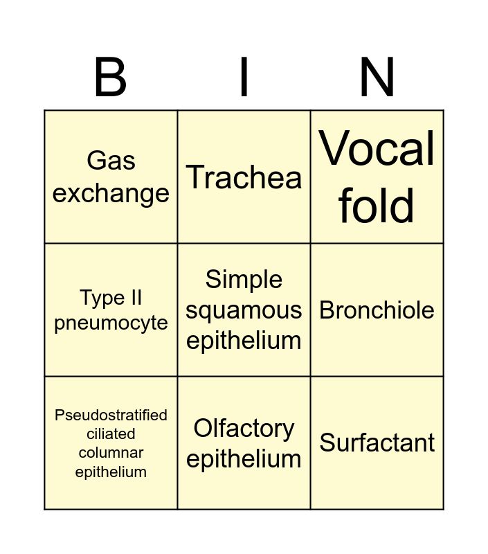 This bingo card has 9 words: Pseudostratified ciliated columnar epithelium, Simple squamous epithelium, Vocal fold, Gas exchange, Trachea, Bronchiole, Type II pneumocyte, Olfactory epithelium and Surfactant.