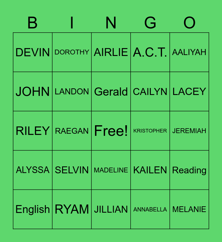 This bingo card has a free space and 30 words: RYAM, HAILEY, RAEGAN, KRISTA, DEVIN, AIRLIE, LANDON, MADELINE, KRISTOPHER, JILLIAN, JEREMIAH, MELANIE, ANNABELLA, JACK, LACEY, SEAN, KAILEN, ALYSSA, SELVIN, AALIYAH, RILEY, ALEXANDRA, DOROTHY, CAILYN, JOHN, A.C.T., Reading, English, Gerald and practice.