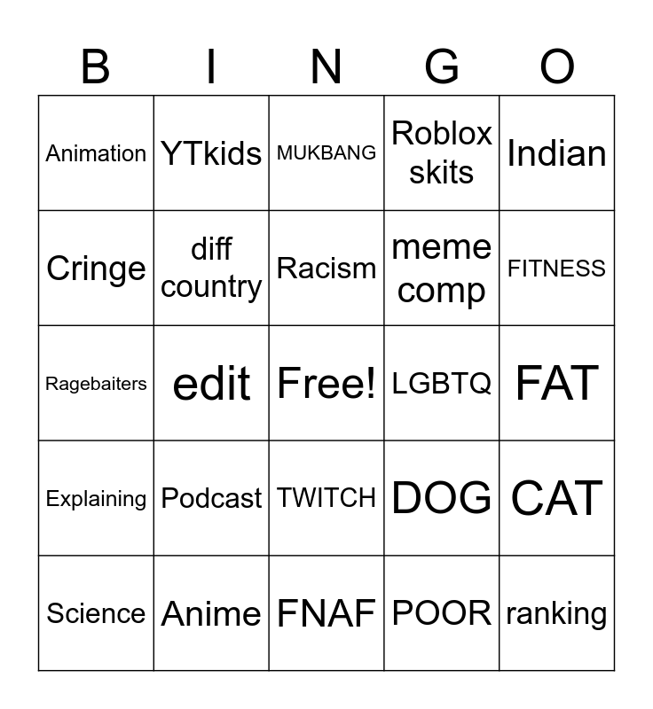 This bingo card has a free space and 24 words: Podcast, Anime, Racism, Science, Indian, Animation, Cringe, YTkids, LGBTQ, TWITCH, meme comp, Ragebaiters, DOG, CAT, diff country, POOR, FAT, MUKBANG, FITNESS, edit, ranking, Explaining, Roblox skits and FNAF.