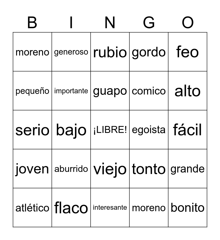 This bingo card has a free space and 25 words: aburrido, interesante, guapo, atlético, feo, moreno, pequeño, generoso, egoista, viejo, comico, serio, tonto, grande, importante, dificil, fácil, rubio, alto, bajo, bonito, flaco, joven, gordo and moreno.