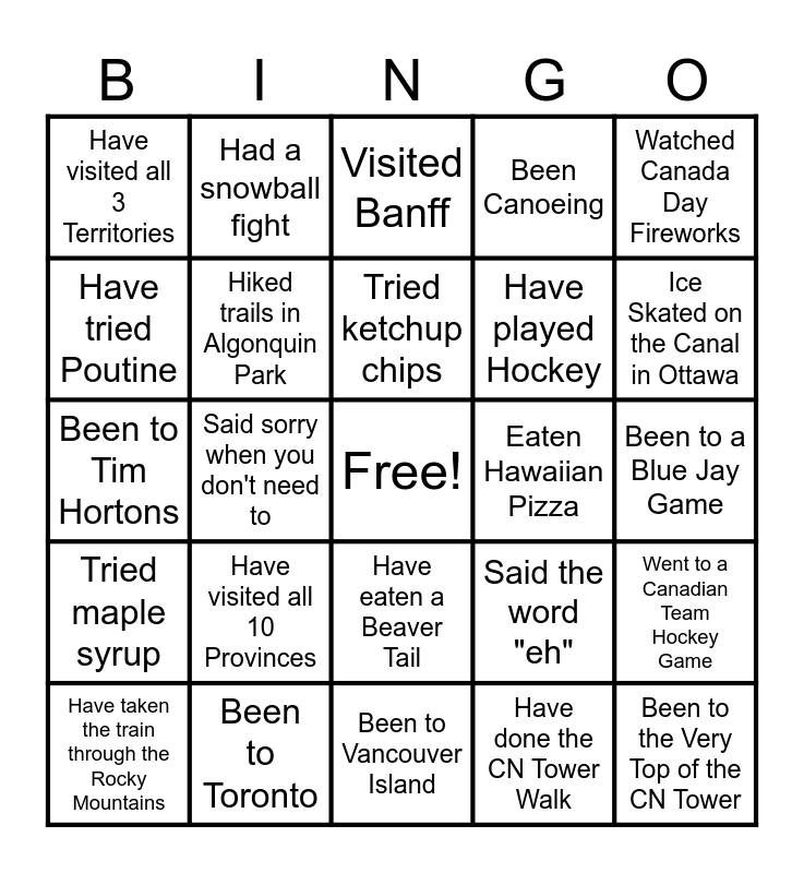 This bingo card has a free space and 24 words: Have visited all 10 Provinces, Been to Toronto, Tried ketchup chips, Have taken the train through the Rocky Mountains, Watched Canada Day Fireworks, Have visited all 3 Territories, Have tried Poutine, Had a snowball fight, Eaten Hawaiian Pizza, Have eaten a Beaver Tail, Have played Hockey, Been to Tim Hortons, Said the word "eh", Went to a Canadian Team Hockey Game, Hiked trails in Algonquin Park, Have done the CN Tower Walk, Been to a Blue Jay Game, Visited Banff, Ice Skated on the Canal in Ottawa, Said sorry when you don't need to, Been to the Very Top of the CN Tower, Tried maple syrup, Been Canoeing and Been to Vancouver Island.