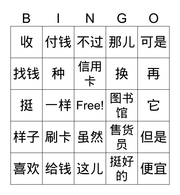This bingo card has a free space and 24 words: 刷卡, 给钱, 信用卡, 喜欢, 可是, 收, 找钱, 付钱, 图书馆, 虽然, 换, 挺, 售货员, 但是, 种, 挺好的, 它, 不过, 再, 一样, 便宜, 样子, 那儿 and 这儿.