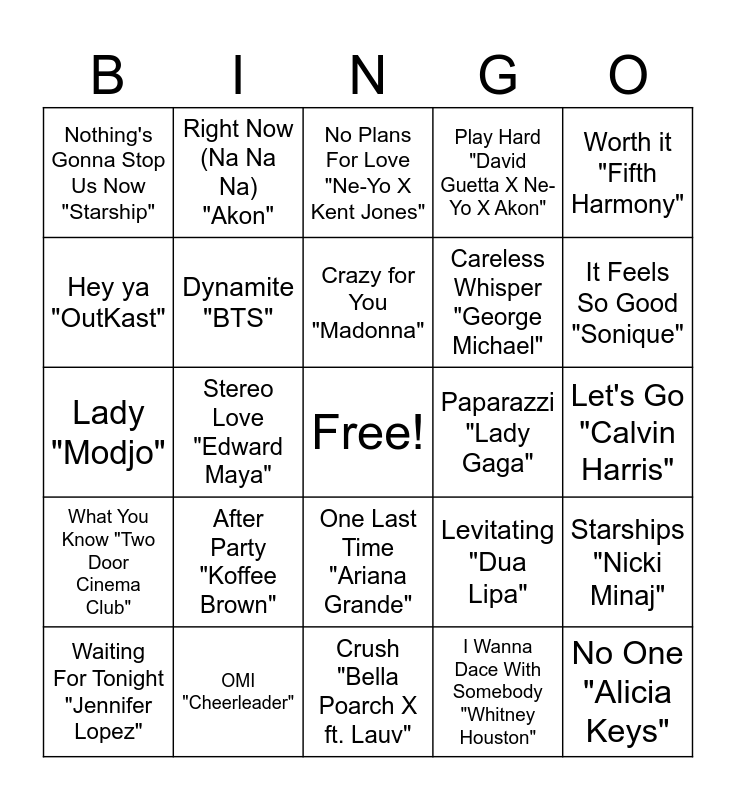 This bingo card has a free space and 65 words: 22 "Taylor Swift", Leave Before You Love Me "Marshmello X Jonas Brothers", Bam Bam "Camila Cabello X Ed Sheeran", Starships "Nicki Minaj", Better Days "Neiked X Mae Muller", One More Time "Daft Punk", Right Now (Na Na Na) "Akon", Friday "Riton X Nightcrawlers", Crazy for You "Madonna", Mr. Saxobeat "Alexandra Stan", One Last Time "Ariana Grande", Boo'd Up "Ella Mai", Let's Go "Calvin Harris", Worth it "Fifth Harmony", Let's Go "Calvin Harris X Ne-Yo", Hey ya "OutKast", Stereo Love "Edward Maya", Nothing's Gonna Stop Us Now "Starship", Got to Be Real "Cheryl Lynn", Careless Whisper "George Michael", After Party "Koffee Brown", What You Know "Two Door Cinema Club", Play Hard "David Guetta X Ne-Yo X Akon", Misery "Maroon 5", Don't Matter "Akon", I Remember "Keyshia Cole", The Sign "Ace of Base", Can't Stop the Feeling "Justin Timberlake", No One "Alicia Keys", Empire State of Mind "Alicia Keys", Waiting For Tonight "Jennifer Lopez", I Will Always Love You "Whitney Houston", Me & U "Cassie", Late Night Talking "Harry Styles", Levitating "Dua Lipa", OMI "Cheerleader", Can't Fight the Moonlight "LeAnn Rimes", Lady "Modjo", I Wanna Dace With Somebody "Whitney Houston", Hold You "Gyptian", Dynamite "BTS", Escapade "Janet Jackson", Paparazzi "Lady Gaga", Dance the Night "Dua Lipa", Maps "Maroon 5", Fallin' For You "Colbie Caillat", It Feels So Good "Sonique", Skate "Bruno Mars X Anderson. Paak X Silk Sonic", Domino "Jessie J", Truth or Dare "Tyla", Golden Hour "JVKE", When I See You "Fantasia", I'm Every Woman "Whitney Houston", Crush "Bella Poarch X ft. Lauv", Girl on Fire "Alicia Keys", Every Little Step "Bobby Brown", Die with a Smile "Lady Gaga X Bruno Mars", No Plans For Love "Ne-Yo X Kent Jones", Better Place "NSYNC", Eyes on You "Nicky Youre", The Way You Make Me Feel "Michael Jackson", Thriller "Michael Jackson", Miss Independent "Ne-Yo", Celebrate "Jonas Brothers" and Forget Me "Lewis Capaldi".