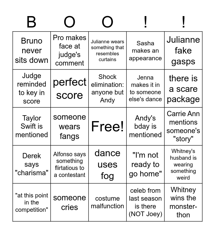 This bingo card has a free space and 29 words: "at this point in the competition", Chessy from Parent Trap shown, someone wears fangs, elimination- camera cuts to a couple who is obviously safe, Bruno never sits down, Julianne wears something that resembles curtains, perfect score, Alfonso says something flirtatious to a contestant, Andy's bday is mentioned, someone cries, Carrie Ann mentions someone's "story", Whitney wins the monster-thon, costume malfunction, celeb from last season is there (NOT Joey), there is a scare package, Bruno wears a see through shirt, dance uses fog, Derek says "charisma", Julianne fake gasps, Taylor Swift is mentioned, "I'm not ready to go home", Dylan Efron with the drop V, Jenna makes it in to someone else's dance, Judge reminded to key in score, Sasha makes an appearance, Pro makes face at judge's comment, Whitney's husband is wearing something weird, Shock elimination: anyone but Andy and Andy eliminated 1st in monster-thon.