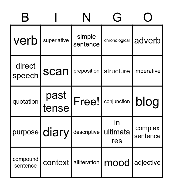 This bingo card has a free space and 59 words: synonym, context, audience, purpose, mood, tone, scan, form, structure, lexical choice, chronological, prose, direct speech, figurative, noun, verb, adjective, adverb, pronoun, preposition, conjunction, simple sentence, compound sentence, complex sentence, minor sentences, declarative, interrogative, exclamatory, imperative, simile, metaphor, personification, symbolism, comparative, superlative, infer, present tense, past tense, future/modal verbs, quotation, anecdote, diary, blog, personal letter, autobiography, slogan, logo, narrative, descriptive, alliteration, assonance, climax, Conclusion/resolution, protagonist, in medias res, in ultimata res, syntax, analogy and diversity.