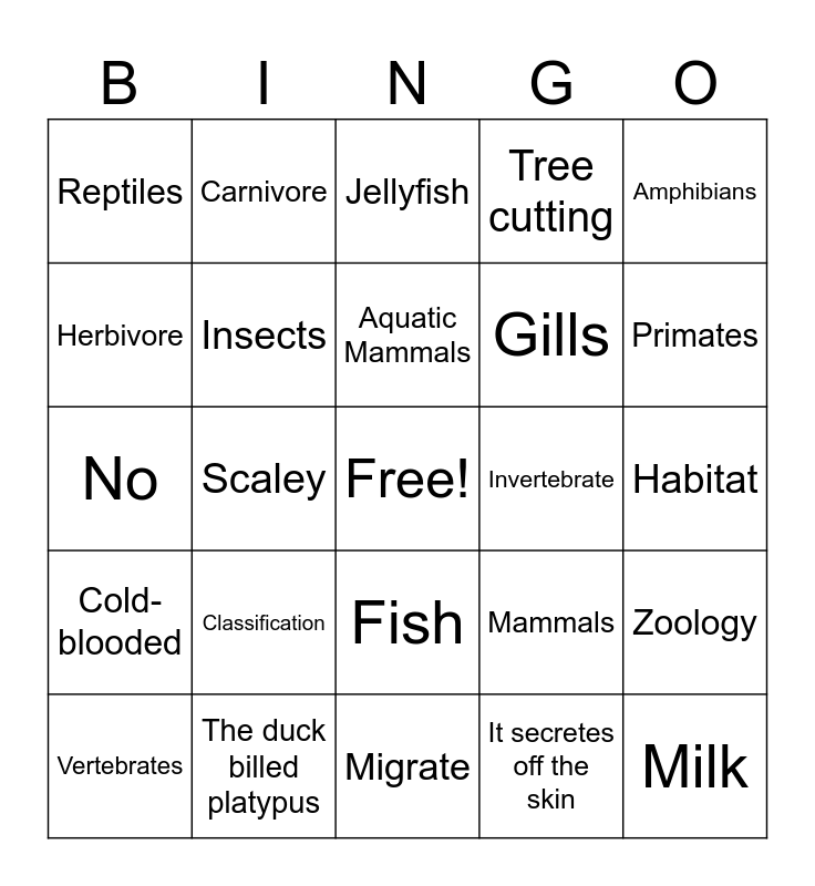 This bingo card has a free space and 24 words: Classification, The duck billed platypus, Aquatic Mammals, Vertebrates, Amphibians, Reptiles, Herbivore, Carnivore, Invertebrate, Fish, Gills, No, Mammals, Zoology, Insects, It secretes off the skin, Habitat, Jellyfish, Primates, Scaley, Milk, Cold-blooded, Tree cutting and Migrate.