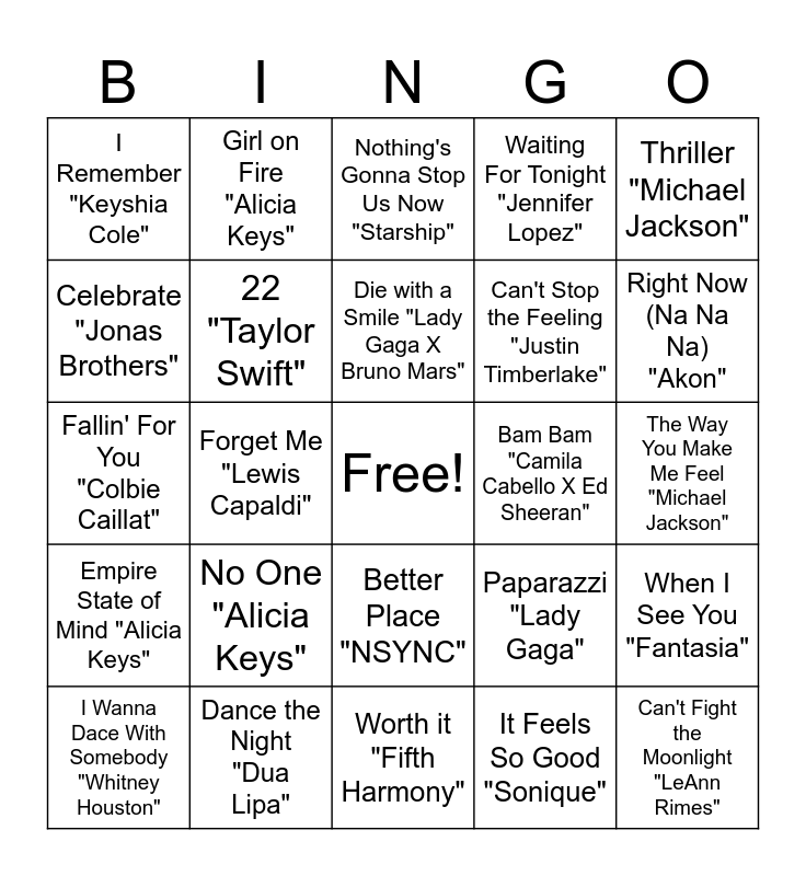 This bingo card has a free space and 65 words: Domino "Jessie J", Truth or Dare "Tyla", Golden Hour "JVKE", When I See You "Fantasia", I'm Every Woman "Whitney Houston", Crush "Bella Poarch X ft. Lauv", Girl on Fire "Alicia Keys", Every Little Step "Bobby Brown", Die with a Smile "Lady Gaga X Bruno Mars", No Plans For Love "Ne-Yo X Kent Jones", Better Place "NSYNC", Eyes on You "Nicky Youre", The Way You Make Me Feel "Michael Jackson", Thriller "Michael Jackson", Miss Independent "Ne-Yo", Celebrate "Jonas Brothers", Forget Me "Lewis Capaldi", I Remember "Keyshia Cole", The Sign "Ace of Base", Can't Stop the Feeling "Justin Timberlake", No One "Alicia Keys", Empire State of Mind "Alicia Keys", Waiting For Tonight "Jennifer Lopez", I Will Always Love You "Whitney Houston", Me & U "Cassie", Late Night Talking "Harry Styles", Levitating "Dua Lipa", OMI "Cheerleader", Can't Fight the Moonlight "LeAnn Rimes", Lady "Modjo", I Wanna Dace With Somebody "Whitney Houston", Hold You "Gyptian", Dynamite "BTS", Escapade "Janet Jackson", Paparazzi "Lady Gaga", Dance the Night "Dua Lipa", Maps "Maroon 5", Fallin' For You "Colbie Caillat", It Feels So Good "Sonique", Skate "Bruno Mars X Anderson. Paak X Silk Sonic", 22 "Taylor Swift", Leave Before You Love Me "Marshmello X Jonas Brothers", Bam Bam "Camila Cabello X Ed Sheeran", Starships "Nicki Minaj", Better Days "Neiked X Mae Muller", One More Time "Daft Punk", Right Now (Na Na Na) "Akon", Friday "Riton X Nightcrawlers", Crazy for You "Madonna", Mr. Saxobeat "Alexandra Stan", One Last Time "Ariana Grande", Boo'd Up "Ella Mai", Let's Go "Calvin Harris", Worth it "Fifth Harmony", Let's Go "Calvin Harris X Ne-Yo", Hey ya "OutKast", Stereo Love "Edward Maya", Nothing's Gonna Stop Us Now "Starship", Got to Be Real "Cheryl Lynn", Careless Whisper "George Michael", After Party "Koffee Brown", What You Know "Two Door Cinema Club", Play Hard "David Guetta X Ne-Yo X Akon", Misery "Maroon 5" and Don't Matter "Akon".