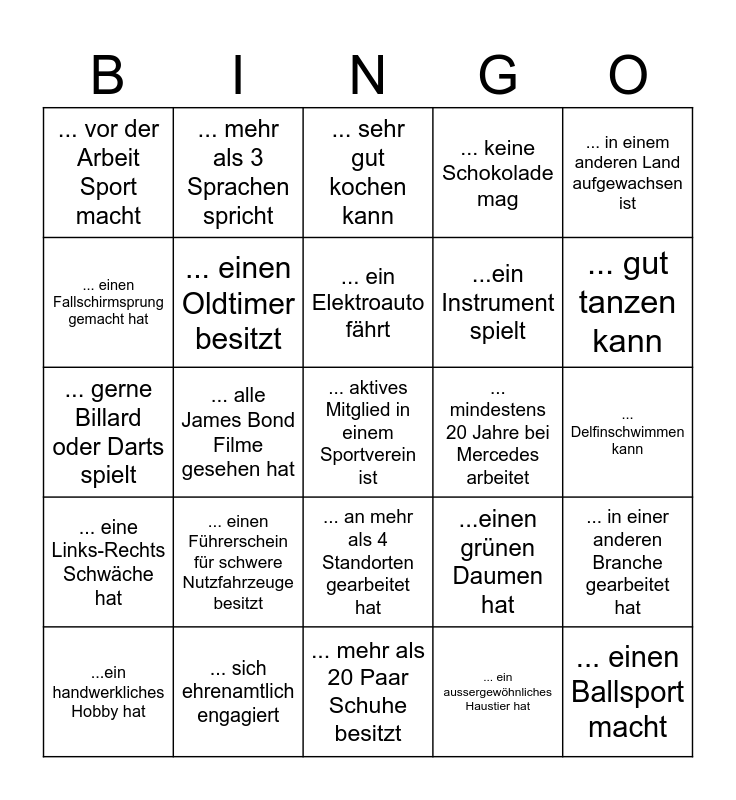 This bingo card has a free space and 24 words: ... einen Führerschein für schwere Nutzfahrzeuge besitzt, ... sich ehrenamtlich engagiert, ... ein Elektroauto fährt, ...ein handwerkliches Hobby hat, ... in einem anderen Land aufgewachsen ist, ... vor der Arbeit Sport macht, ... einen Fallschirmsprung gemacht hat, ... mehr als 3 Sprachen spricht, ... mindestens 20 Jahre bei Mercedes arbeitet, ... an mehr als 4 Standorten gearbeitet hat, ...ein Instrument spielt, ... gerne Billard oder Darts spielt, ...einen grünen Daumen hat, ... in einer anderen Branche gearbeitet hat, ... einen Oldtimer besitzt, ... ein aussergewöhnliches Haustier hat, ... Delfinschwimmen kann, ... sehr gut kochen kann, ... gut tanzen kann, ... alle James Bond Filme gesehen hat, ... einen Ballsport macht, ... eine Links-Rechts Schwäche hat, ... keine Schokolade mag and ... mehr als 20 Paar Schuhe besitzt.