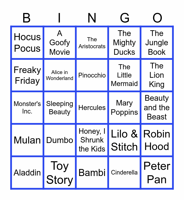This bingo card has 25 words: Dumbo, Bambi, Pinocchio, Aladdin, The Jungle Book, Hocus Pocus, Freaky Friday, A Goofy Movie, Mary Poppins, Honey, I Shrunk the Kids, The Little Mermaid, Monster's Inc., Lilo & Stitch, Robin Hood, Alice in Wonderland, Peter Pan, Beauty and the Beast, The Aristocrats, The Lion King, Sleeping Beauty, Hercules, Toy Story, Mulan, The Mighty Ducks and Cinderella.
