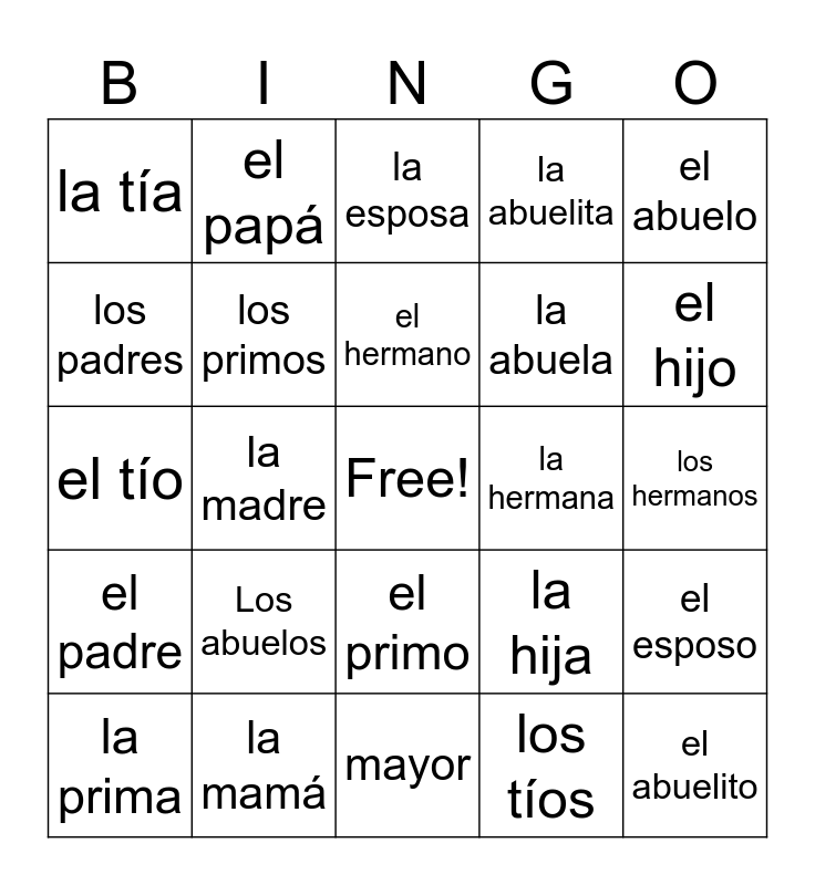 This bingo card has a free space and 24 words: Los abuelos, la mamá, el hermano, la prima, el abuelo, la tía, los padres, el papá, la hermana, el primo, la abuela, el tío, la hija, el esposo, los primos, los tíos, los hermanos, la esposa, el hijo, la madre, el abuelito, el padre, la abuelita and mayor.