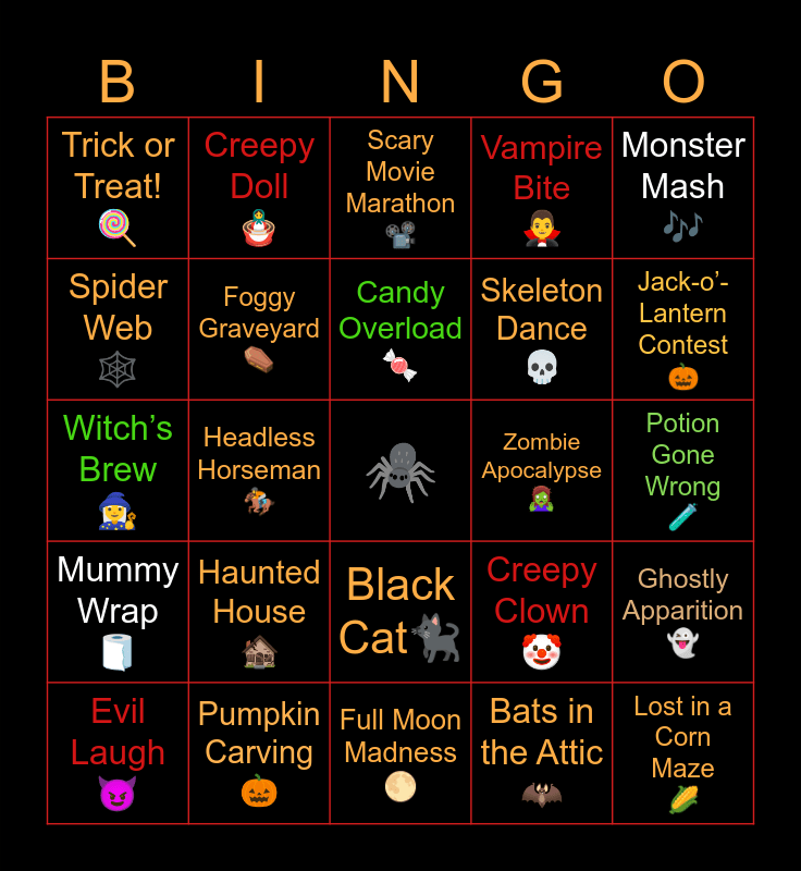 This bingo card has a free space and 24 words: Evil Laugh π, Haunted HouseποΈ, Candy Overload π¬, Bats in the Attic π¦, Monster Mash πΆ, Trick or Treat! π, Creepy Doll πͺ, Scary Movie Marathon π½οΈ, Zombie Apocalypse π§ββοΈ, Potion Gone Wrong π§ͺ, Witchβs Brew π§ββοΈ, Foggy Graveyard β°οΈ, Creepy Clown π€‘, Ghostly Apparitionπ», Spider Web πΈοΈ, Pumpkin Carvingπ, Full Moon Madness π, Vampire Bite π§ββοΈ, Jack-oβ-Lantern Contest π, Mummy Wrap π§», Headless Horseman π, Black Catπββ¬, Skeleton Dance π and Lost in a Corn Maze π½.