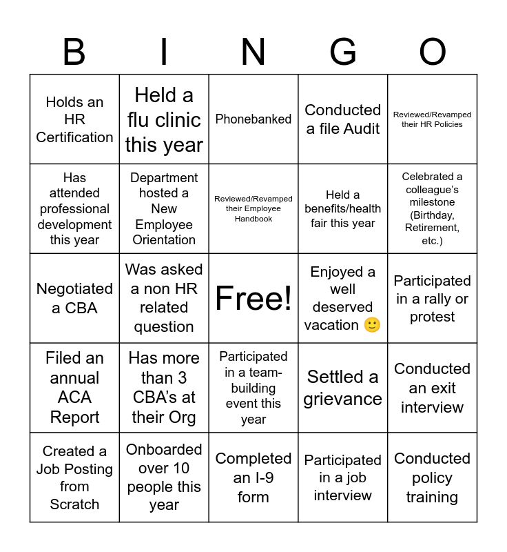 This bingo card has a free space and 24 words: Has more than 3 CBA’s at their Org, Onboarded over 10 people this year, Reviewed/Revamped their Employee Handbook, Created a Job Posting from Scratch, Reviewed/Revamped their HR Policies, Holds an HR Certification, Has attended professional development this year, Held a flu clinic this year, Enjoyed a well deserved vacation 🙂, Participated in a team-building event this year, Held a benefits/health fair this year, Negotiated a CBA, Settled a grievance, Conducted an exit interview, Department hosted a New Employee Orientation, Participated in a job interview, Participated in a rally or protest, Phonebanked, Celebrated a colleague’s milestone (Birthday, Retirement, etc.), Was asked a non HR related question, Conducted policy training, Filed an annual ACA Report, Conducted a file Audit and Completed an I-9 form.
