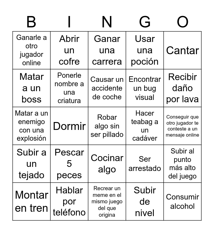 This bingo card has a free space and 24 words: Pescar 5 peces, Hablar por teléfono, Causar un accidente de coche, Montar en tren, Cantar, Ganarle a otro jugador online, Matar a un boss, Abrir un cofre, Hacer teabag a un cadáver, Cocinar algo, Encontrar un bug visual, Matar a un enemigo con una explosión, Ser arrestado, Subir al punto más alto del juego, Ponerle nombre a una criatura, Subir de nivel, Conseguir que otro jugador te conteste a un mensaje online, Ganar una carrera, Recibir daño por lava, Dormir, Consumir alcohol, Subir a un tejado, Usar una poción and Recrear un meme en el mismo juego del que origina.