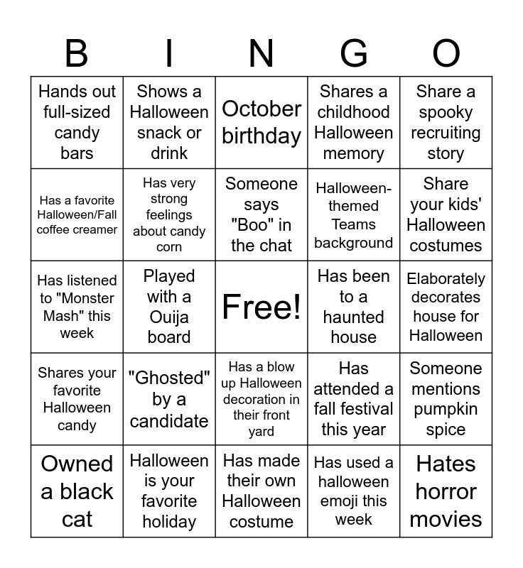 This bingo card has a free space and 29 words: Owned a black cat, Never went trick or treating, Played with a Ouija board, Has dressed up in a couples costume, Hands out full-sized candy bars, October birthday, Has very strong feelings about candy corn, "Ghosted" by a candidate, Has been to a haunted house, Halloween is your favorite holiday, Elaborately decorates house for Halloween, Hates horror movies, Has made their own Halloween costume, Has used a halloween emoji this week, Share your kids' Halloween costumes, Has carved pumpkins, Has a blow up Halloween decoration in their front yard, Shares your favorite Halloween candy, Share a spooky recruiting story, Has listened to "Monster Mash" this week, Has attended a fall festival this year, Has a pet Halloween costume picked out, Halloween-themed Teams background, Has a favorite Halloween/Fall coffee creamer, Shares a childhood Halloween memory, Shows a Halloween snack or drink, Someone mentions pumpkin spice, Someone says "Boo" in the chat and Shares a favorite crime podcast or horror book.