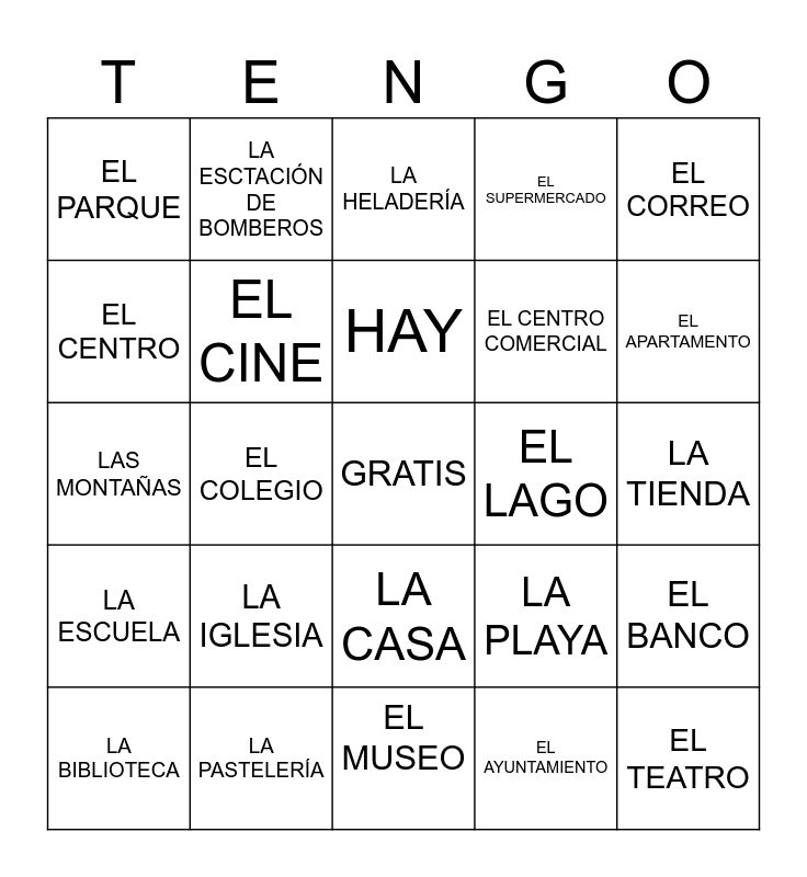 This bingo card has a free space and 39 words: LA CIUDAD, EL PUEBLO, LA CALLE, EL CINE, LA BIBLIOTECA, LA CASA, HAY, TIENE, EL CORREO, LA ESCUELA, EL COLEGIO, EL SUPERMERCADO, EL TEATRO, LA TIENDA, EL LAGO, LA IGLESIA, EL AEROPUERTO, EL PARQUE, LA PISCINA, LA PLAYA, EL CENTRO, EL MUSEO, EL CENTRO COMERCIAL, EL APARTAMENTO, LA PLAZA, ES, LA COMUNIDAD, EL ESTADIO, LA UNVERSIDAD, LA ESCTACIÓN DE BOMBEROS, EL ALMACÉN, EL CAFÉ, LA HELADERÍA, LA PASTELERÍA, EL AYUNTAMIENTO, EL BARRIO, EL BANCO, LAS MONTAÑAS and LA CARNICERÍA.