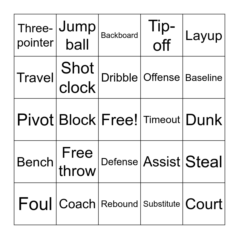 This bingo card has a free space and 25 words: Free throw, Rebound, Dribble, Foul, Layup, Three-pointer, Travel, Jump ball, Timeout, Defense, Offense, Pivot, Assist, Steal, Shot clock, Pass, Dunk, Backboard, Baseline, Block, Court, Coach, Bench, Tip-off and Substitute.