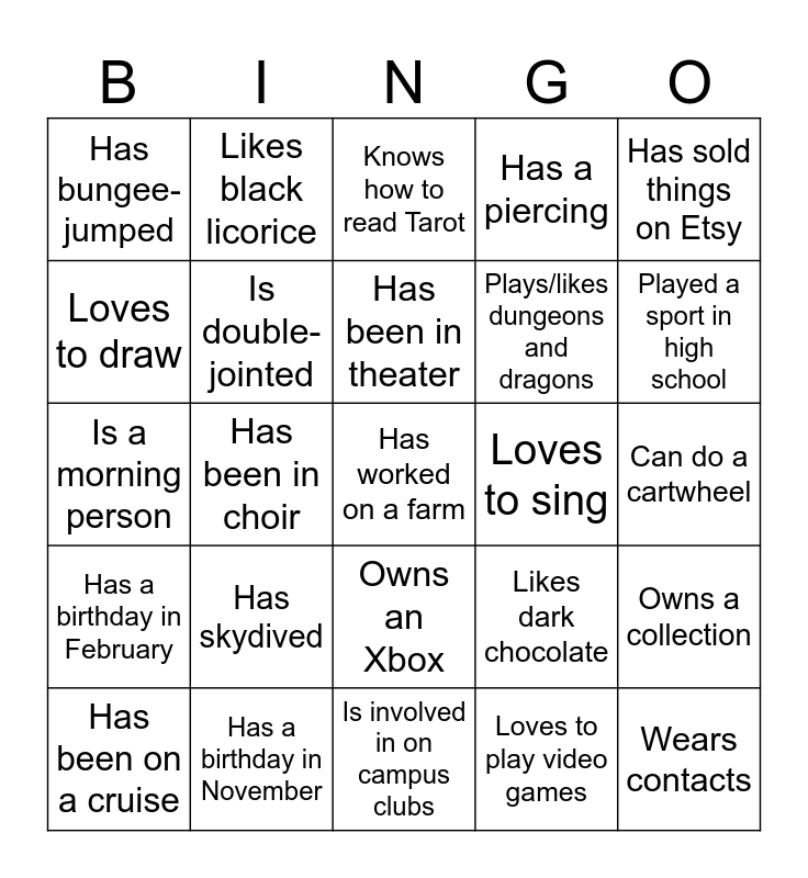 This bingo card has 113 words: Free!, Has been out of the country, Owns an exotic pet, Has been to the grand canyon, Has dyed their hair before, Is in or has family in the military, Has a piercing, Loves Rollercoasters, Attending RMU from out of state, Has an older sister, Has an older brother, Has a younger sister, Has a younger brother, Coffee Fiend, Loves to garden, Owns a Switch 2, Owns an Xbox, Likes to Skateboard, Steelers Fan, Has a nickname, Has been on a cruise, Knows how to read Tarot, Likes pineapple on pizza, Has a birthday in July, Has a birthday in April, Has a birthday in February, Has a birthday in November, Can speak 2 languages, Has won a contest/competition, Only child, Played a sport in high school, Has been in theater, Has been in choir, Has a tattoo, Is left-handed, Has been to Niagara Falls, Nursing Major, Engineering Major, Education Major, Owns their own car, Has met a celebrity, Pittsburgh-native, Favorite holiday is Christmas, Favorite holiday is Halloween, Has been to a concert this year, Loves to bake, Loves to play video games, Loves to draw, Loves to work-out, Loves photography, Loves movies, Loves to sing, Plays an instrument, Likes country music, Likes punk music, Likes Kpop, Wears contacts, Loves to ski/snowboard, Knows how to juggle, Knows how to change a tire, Owns a collection, Has brown eyes, Has blue eyes, Was in Boy Scouts/Girl Scouts, Can roll their r's, Can touch their tongue to their nose, Can wiggle their ears, Is double-jointed, Is a morning person, Is a night-owl, Can do a cartwheel, Likes playing chess, Is a twin or has twins in their family, Has ridden a horse, Has been white-water rafting, Has worked on a farm, Has skydived, Has bungee-jumped, Likes to hunt, Likes to fish, Goes to church, Likes black licorice, Likes candy corn, Likes dark chocolate, Plays/likes dungeons and dragons, Listens to podcasts, Was a class clown in school, Enjoys fashion, Favorite holiday is Winter, Favorite holiday is Summer, Is/was in a band, Wants to move abroad after school, Has sold things on Etsy, Likes to make jewelry, Is/was in a book club, Has worked in a mall, Has worked in a restaurant, Likes to stream, Likes to do crafts, Is still best friends with their elementary school best friend, Likes horror movies, Likes romance movies, Has no volume control, Is soft spoken, Likes to shop, Has a 4.0 (or higher) GPA, Is involved in on campus clubs, Likes to work on cars, Likes to paint nails, Has a halloween costume planned this year, Has messy handwriting, Likes Seafood and Likes sushi.
