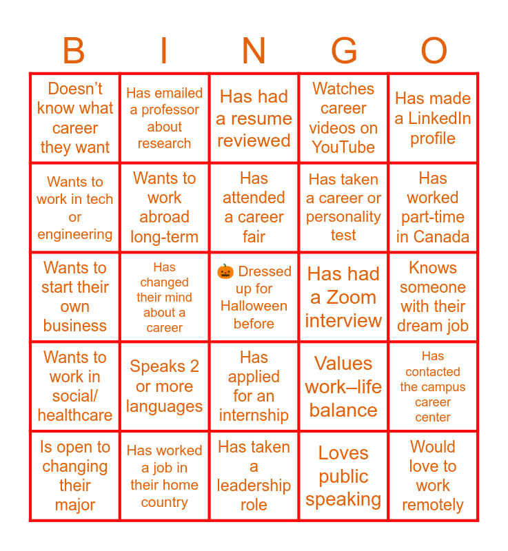 This bingo card has a free space and 24 words: Speaks 2 or more languages, Has worked a job in their home country, Has attended a career fair, Is open to changing their major, Has made a LinkedIn profile, Doesn’t know what career they want, Wants to work in tech or engineering, Has emailed a professor about research, Has had a Zoom interview, Has applied for an internship, Has taken a career or personality test, Wants to start their own business, Values work–life balance, Has contacted the campus career center, Wants to work abroad long-term, Loves public speaking, Knows someone with their dream job, Has had a resume reviewed, Has worked part-time in Canada, Has changed their mind about a career, Would love to work remotely, Wants to work in social/ healthcare, Watches career videos on YouTube and Has taken a leadership role.