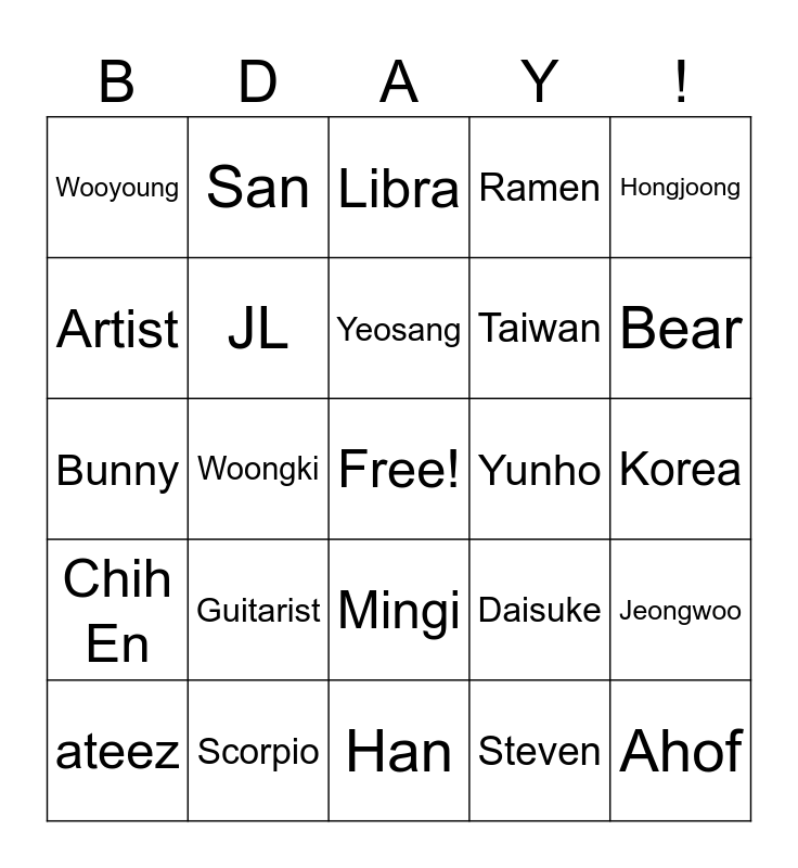 This bingo card has a free space and 30 words: ateez, Jongho, Yeosang, Seonghwa, Hongjoong, Wooyoung, San, Mingi, Yunho, Ahof, Chih En, JL, Shuaibo, Steven, Jeongwoo, Juwon, Woongki, Han, Daisuke, Bear, Bunny, Scorpio, Libra, Taiwan, Korea, Artist, Guitarist, Chips in Yogurt, Ramen and Day6.
