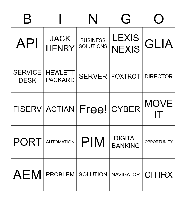 This bingo card has a free space and 75 words: ACCESS MANAGEMENT, ASSET MANAGEMENT, BUSINESS SOLUTIONS, COMPUTER OPS, DATABASE, ENDPOINT, INFO SEC, INFRASTRUCTURE, NETCOM, PSM, QA, SALESFORCE, SERVER, SERVICE DESK, WEBDEV, ACTIAN, CISCO, CITIRX, DELUXE, GLIA, FIS, FISERV, HEWLETT PACKARD, JACK HENRY, LEXIS NEXIS, MICROSOFT, NCR, Q2, SOLAR WINDS, WELLS FARGO, BUSINESS ANALYTICS, CARD WIZARD, COMMUNICATOR OPEN, DIGITAL BANKING, DIRECTOR, FOXTROT, TERAFINA, INTEGRATED TELLER, MOVE IT, NAVIGATOR, NEXT GEN, PAYMENTS EXCHANGE, PEP+, PROOFPOINT, SHAREPOINT, ACH, AEM, API, DFC, DR, IVR, PIM, POB, RFC, RPA, SDC, SLA, SQL, VLAN, VPN, AUTOMATION, BANDWIDTH, BOT, CIRCUIT, CLOUD, CYBER, DIGITAL, GATEWAY, NETWORK, OPPORTUNITY, PORT, PROBLEM, REBOOT, SOLUTION and VIRTUAL.