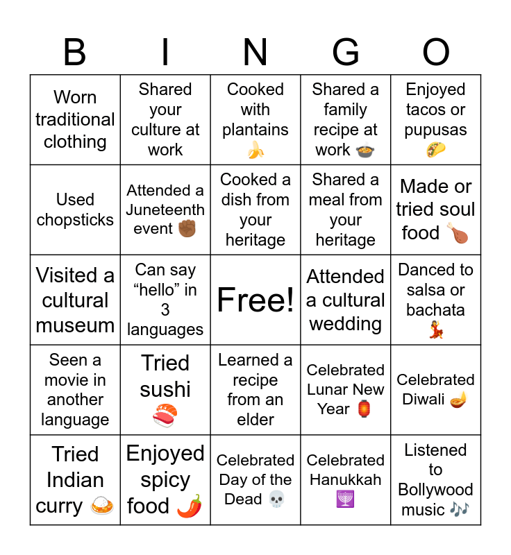 This bingo card has a free space and 24 words: Tried sushi ๐ฃ, Enjoyed spicy food ๐ถ๏ธ, Cooked a dish from your heritage, Tried Indian curry ๐, Enjoyed tacos or pupusas ๐ฎ, Worn traditional clothing, Used chopsticks, Shared your culture at work, Attended a cultural wedding, Learned a recipe from an elder, Shared a meal from your heritage, Visited a cultural museum, Celebrated Lunar New Year ๐ฎ, Celebrated Diwali ๐ช, Attended a Juneteenth event โ๐พ, Celebrated Hanukkah ๐, Danced to salsa or bachata ๐, Cooked with plantains ๐, Made or tried soul food ๐, Can say โhelloโ in 3 languages, Listened to Bollywood music ๐ถ, Seen a movie in another language, Shared a family recipe at work ๐ฒ and Celebrated Day of the Dead ๐.