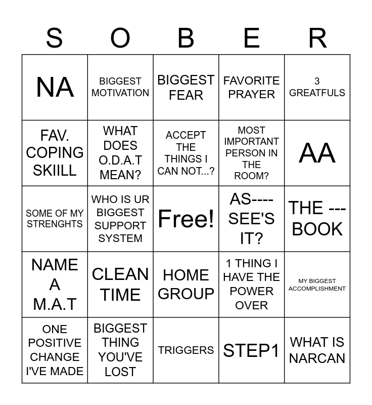 This bingo card has a free space and 24 words: CLEAN TIME, BIGGEST THING YOU'VE LOST, ACCEPT THE THINGS I CAN NOT...?, ONE POSITIVE CHANGE I'VE MADE, 3 GREATFULS, NA, FAV. COPING SKIILL, BIGGEST MOTIVATION, AS----SEE'S IT?, HOME GROUP, MOST IMPORTANT PERSON IN THE ROOM?, SOME OF MY STRENGHTS, 1 THING I HAVE THE POWER OVER, MY BIGGEST ACCOMPLISHMENT, WHAT DOES O.D.A.T MEAN?, STEP1, THE --- BOOK, BIGGEST FEAR, AA, WHO IS UR BIGGEST SUPPORT SYSTEM, WHAT IS NARCAN, NAME A M.A.T, FAVORITE PRAYER and TRIGGERS.