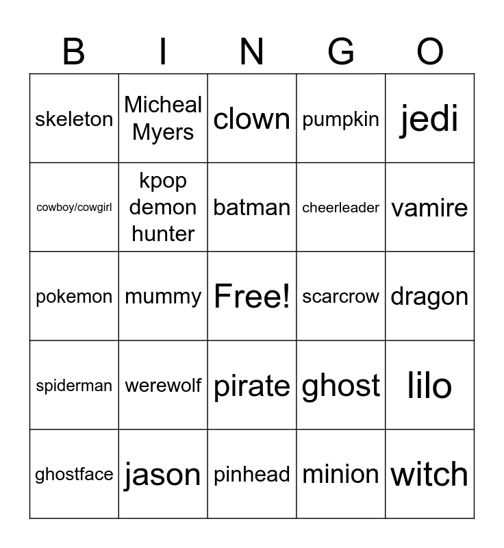 This bingo card has a free space and 36 words: Elphaba the wicked witch, Glinda the good witch, wednesday, kpop demon hunter, ghost, spiderman, batman, the joker, jedi, princess, mummy, pumpkin, bat, scarcrow, vamire, skeleton, zombie, werewolf, witch, clown, dragon, lilo, jason, ghostface, pinhead, Micheal Myers, pokemon, stitch, cheerleader, cowboy/cowgirl, sonic, dinosaur, minion, pirate, food item and family group costume.