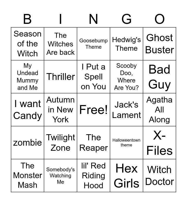 This bingo card has a free space and 34 words: Bring Me To Life, Hex Girls, Evil Like Me, This is Halloween, zombie, Thriller, Ghost Buster, The Monster Mash, The Witches Are back, Stranger Things, I Put a Spell on You, Goosebump Theme, Rotten to The Core, Vampire, Jack's Lament, Bad Guy, Somebody's Watching Me, I want Candy, Twilight Zone, Halloweentown theme, The Reaper, Bewitched, Season of the Witch, Agatha All Along, lil' Red Riding Hood, Witch Doctor, Hedwig's Theme, The Phantom of The Opera, Scooby Doo, Where Are You?, My Undead Mummy and Me, Spooky, Scary Skeletons, Autumn in New York, X-Files and Friends on The Other Side.