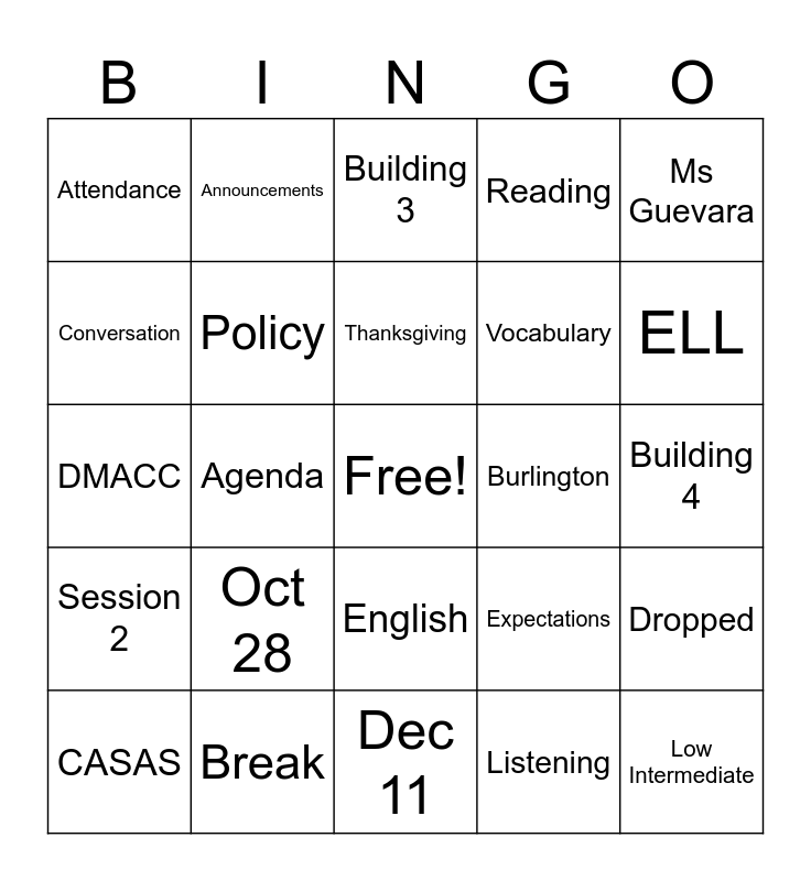 This bingo card has a free space and 25 words: Oct 28, Dec 11, Thanksgiving, CASAS, Ms Guevara, Attendance, Conversation, Announcements, Burlington, English, Vocabulary, DMACC, Expectations, Dropped, Policy, Urban Campus, Building 4, Building 3, ELL, Agenda, Low Intermediate, Break, Session 2, Reading and Listening.