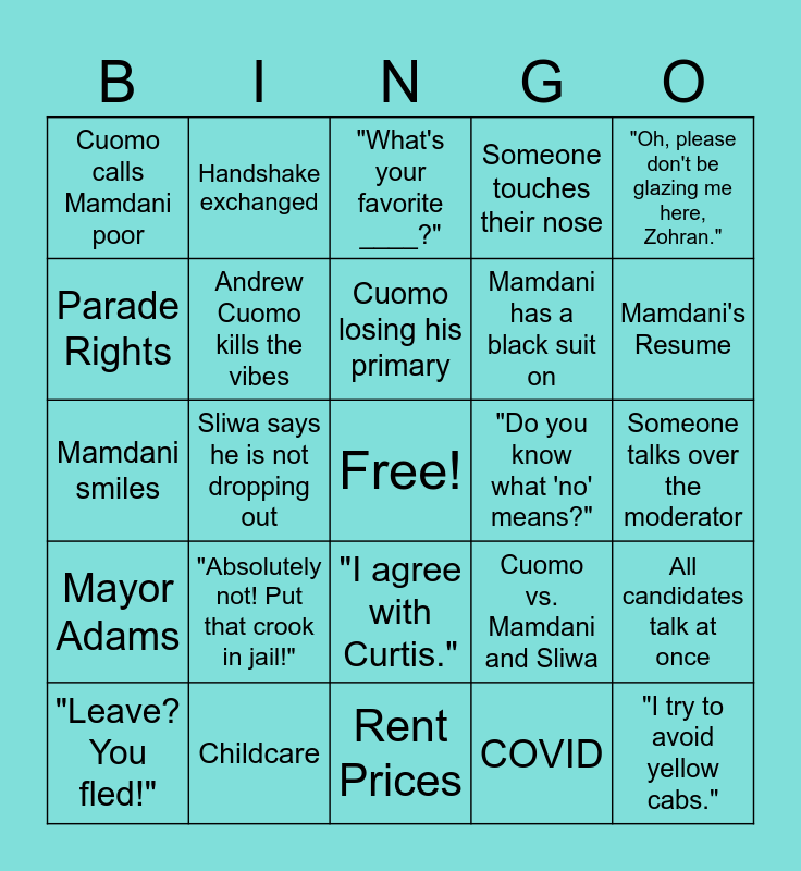 This bingo card has a free space and 24 words: "Absolutely not! Put that crook in jail!", Childcare, Cuomo losing his primary, "Leave? You fled!", "Oh, please don't be glazing me here, Zohran.", Cuomo calls Mamdani poor, Parade Rights, Handshake exchanged, "Do you know what 'no' means?", "I agree with Curtis.", Mamdani has a black suit on, Mamdani smiles, Cuomo vs. Mamdani and Sliwa, All candidates talk at once, Andrew Cuomo kills the vibes, COVID, Someone talks over the moderator, "What's your favorite ____?", Mamdani's Resume, Sliwa says he is not dropping out, "I try to avoid yellow cabs.", Mayor Adams, Someone touches their nose and Rent Prices.