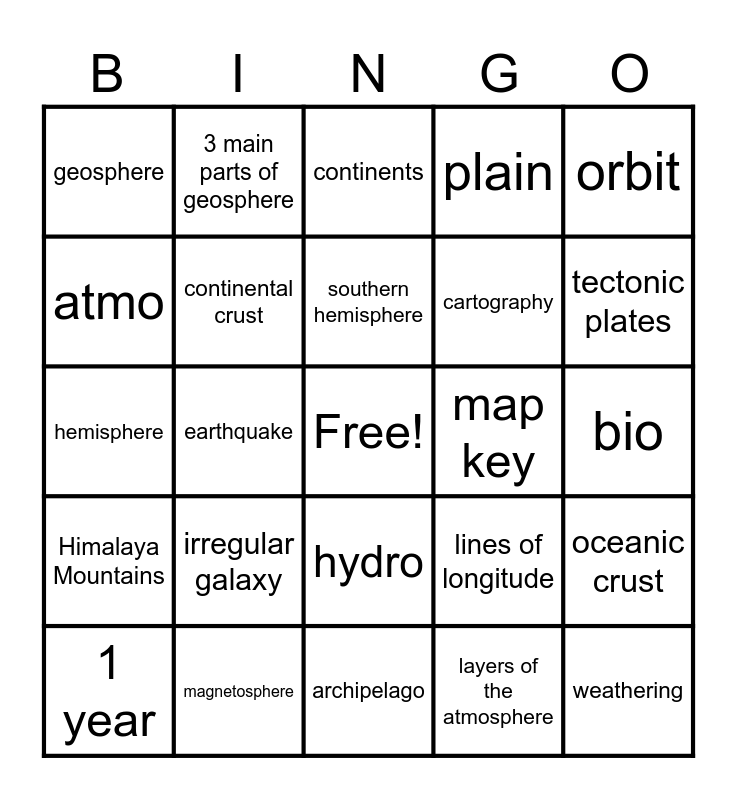 This bingo card has a free space and 24 words: irregular galaxy, magnetosphere, southern hemisphere, 1 year, orbit, geosphere, atmo, 3 main parts of geosphere, map key, hydro, cartography, hemisphere, lines of longitude, oceanic crust, continental crust, layers of the atmosphere, bio, continents, tectonic plates, earthquake, weathering, Himalaya Mountains, plain and archipelago.