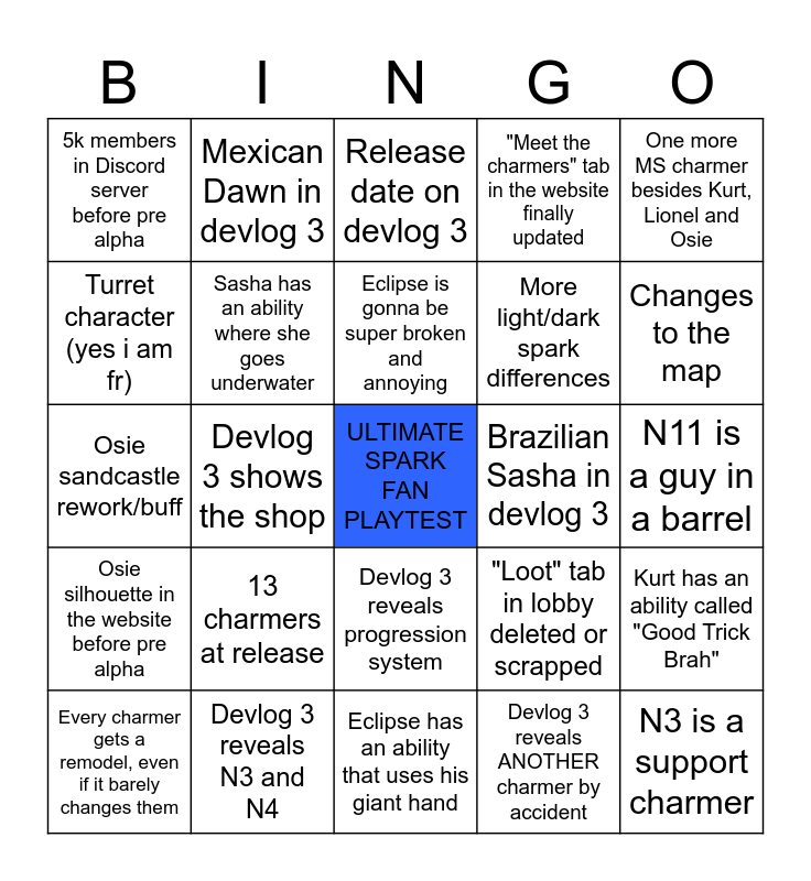 This bingo card has a free space and 24 words: 13 charmers at release, Devlog 3 reveals N3 and N4, Eclipse is gonna be super broken and annoying, Every charmer gets a remodel, even if it barely changes them, One more MS charmer besides Kurt, Lionel and Osie, 5k members in Discord server before pre alpha, Turret character (yes i am fr), Mexican Dawn in devlog 3, Brazilian Sasha in devlog 3, Devlog 3 reveals progression system, More light/dark spark differences, Osie sandcastle rework/buff, "Loot" tab in lobby deleted or scrapped, Kurt has an ability called "Good Trick Brah", Sasha has an ability where she goes underwater, Devlog 3 reveals ANOTHER charmer by accident, N11 is a guy in a barrel, Release date on devlog 3, Changes to the map, Devlog 3 shows the shop, N3 is a support charmer, Osie silhouette in the website before pre alpha, "Meet the charmers" tab in the website finally updated and Eclipse has an ability that uses his giant hand.